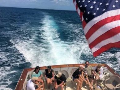 Forty visiting neighbors on board and ready to spend a whole day on our private Sanctuary Belize island. I love our flag flying off this Belizean boat.